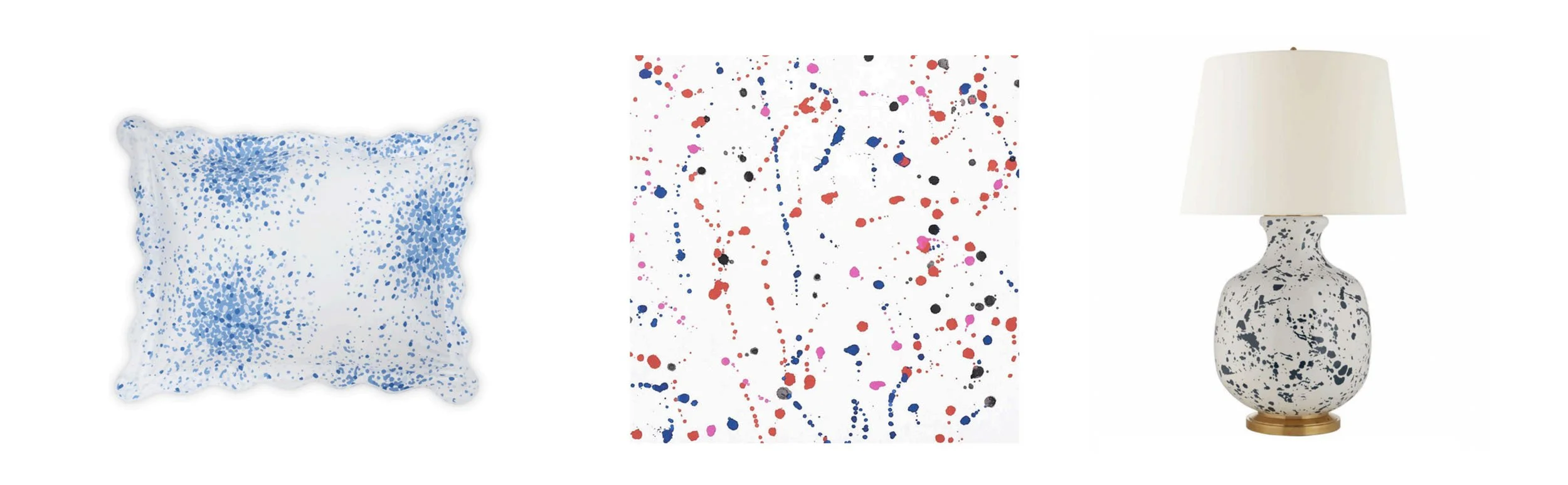 Left: Poppy Sham by Matouk; Center: Ink Splash Wallcovering by Schumacher; Right: Christopher Spitzmiller Buatta Blue Splatter Table Lamp at Visual Comfort